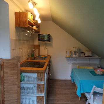 Zur Ausstattung gehören eine kleine Küche, ein Wohnzimmer mit einer Schlafmöglichkeit für eine Person, TV und Radio. Im Erdgeschoss ist auch das Bad mit Dusche und WC. Im Obergeschoss befindet sich das Schlafzimmer für zwei Personen. Eine Aufbettung für ein Kleinkind ist vorhanden.
